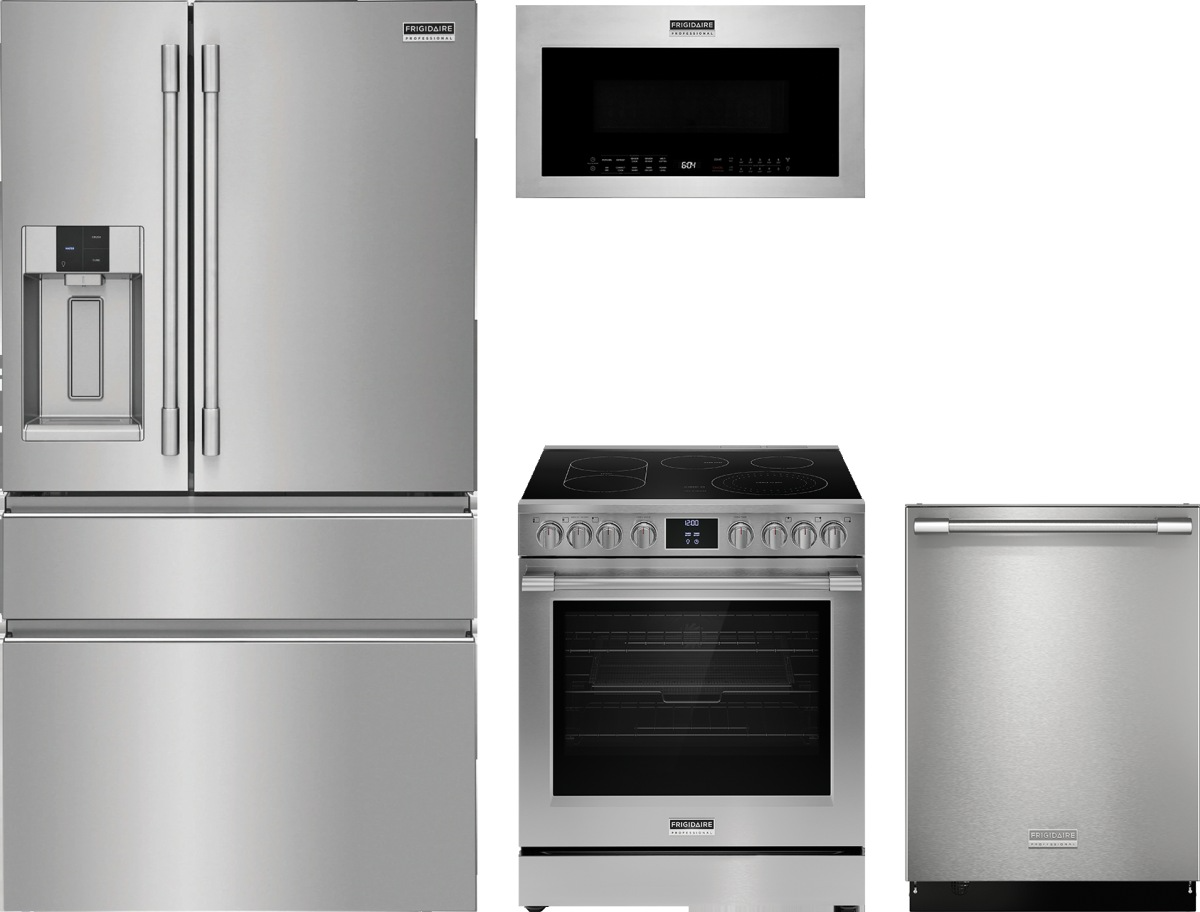 Frigidaire Professional® 4 Piece Smudge-Proof® Stainless Steel Kitchen Package with French Door Refrigerator, Top Control Dishwasher, Freestanding Electric Range, and Over The Range Microwave.Read More