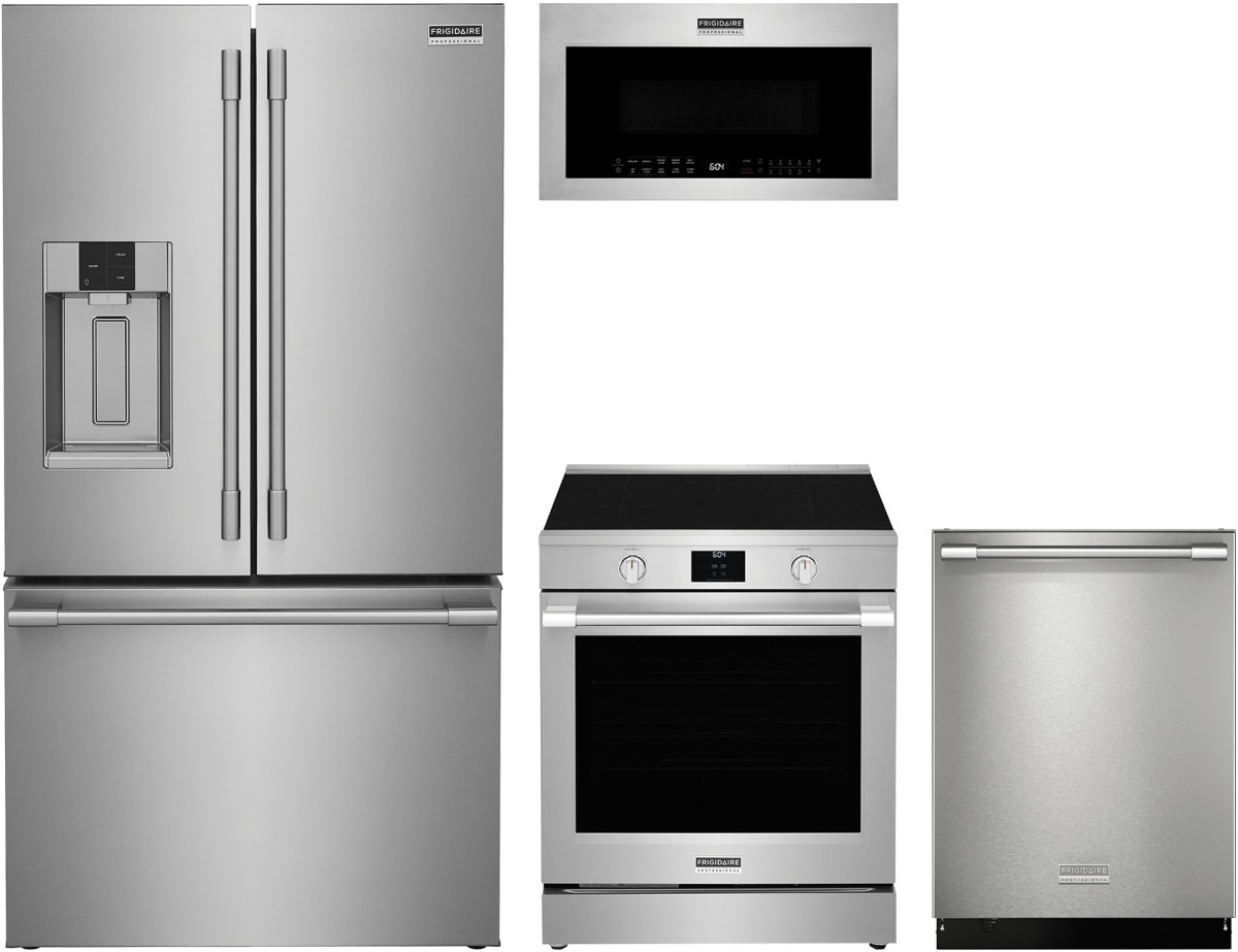 Frigidaire Professional® 4 Piece Smudge-Proof™ stainless steel kitchen package with counter depth French door refrigerator, top control built in dishwasher, freestanding induction range, and over the range microwave.Read More