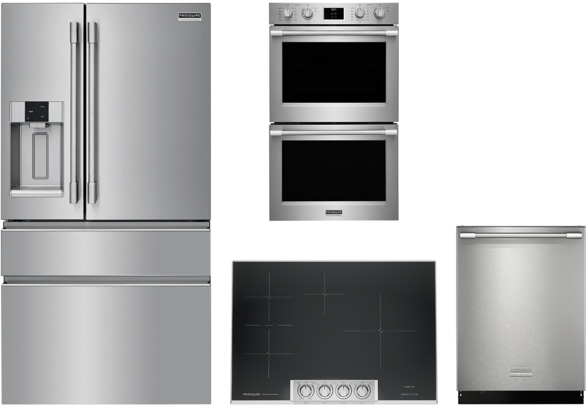 Frigidaire Professional® 4 Piece Smudge-Proof™ Stainless Steel Kitchen Package with counter depth French door refrigerator, top control built in dishwasher, induction cooktop, and double electric wall oven.Read More