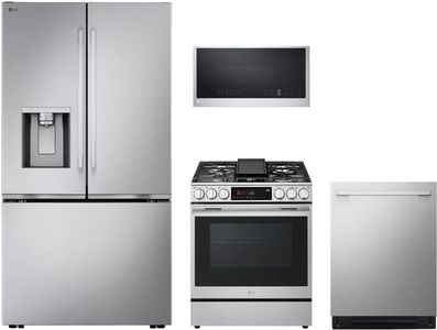 LG 4 Piece PrintProof™ Stainless Steel Kitchen Package with French door refrigerator, top control built-in dishwasher, slide-in electric range, and smart over the range microwave.Read More