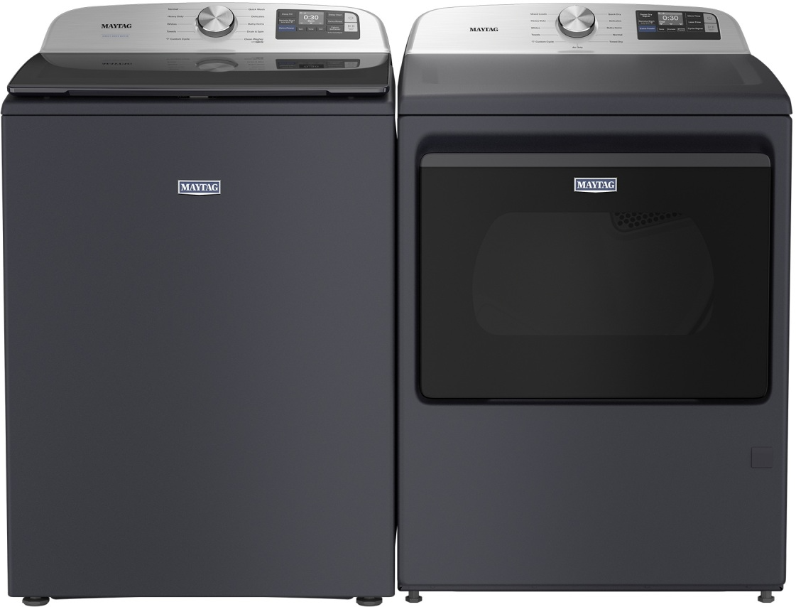 Maytag® Midnight Steel Laundry Pair with 5.2 Cu. Ft. capacity top load washer and 7.4 Cu. Ft. front load gas dryer with extra power.Read More